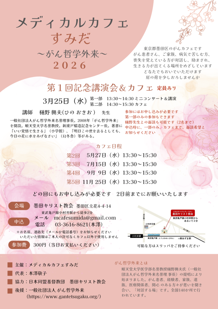 当教会を会場にメディカルカフェすみだ~がん哲学外来~が行われます。第一回は講師に樋野興夫先生をお迎えして、3月25日(水)に開催予定です。詳細はチラシをご覧くださり、参加ご希望の方はお申し込みください(定員があります)。がん、またその他の喪失によって心に痛みを覚えている方、よろしかったらどうぞご参加ください。お待ちしております。